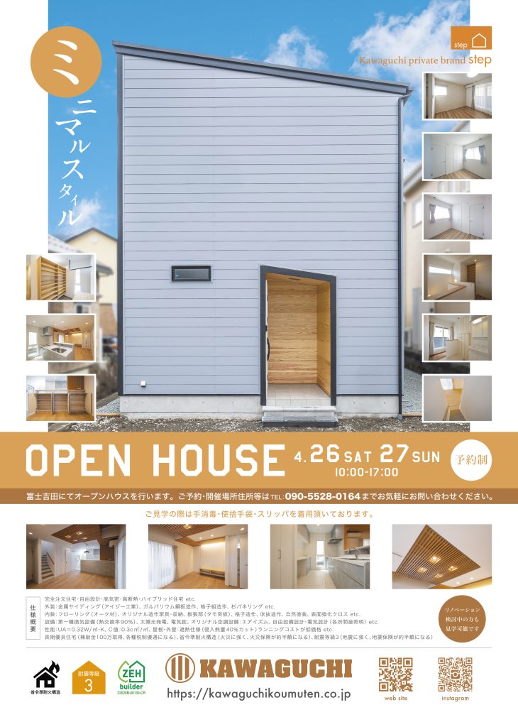 2025.04.02 OPENHOUSEのご案内 2025.04 OPENHOUSEのご案内 2025.04 4/26(土).4/27(日)オープンハウス開催致します。 10:00 ~ 17:00 詳しい場所等含め、お気軽にお問い合わせください。 PDFもご覧ください。 ビジネスパートナー募集のおしらせ 前の記事 OPENHOUSEのご案内 2025.09 次の記事